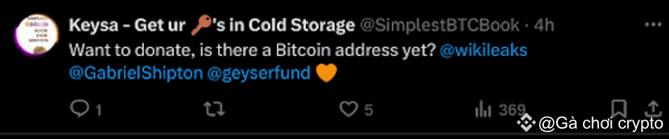 Không có gì đáng ngạc nhiên khi có một lựa chọn mới để quyên góp tiền bằng Bitcoin, vì Julian Assange và gia đình của ông từ lâu đã trở thành một phần trong tấm thảm thêu của Bitcoin. Julian đã nói chuyện với Satoshi về việc chấp nhận quyên góp bằng Bitcoin cho Wikileaks . Đó là cơ hội khi PayPal đóng băng số tiền dành cho Wikileaks. Julian cũng đã nói về niềm đam mê sâu sắc của mình và viết về Bitcoin, chẳng hạn như trong Reddit AMA , nơi anh ấy viết: “Có rất nhiều điều về Bitcoin trong cuốn sách của tôi – về những suy nghĩ của tôi về nó và lịch sử của WikiLeaks với nó. Eric Schmidt và tôi đã thảo luận một lúc về nó và tôi cũng đưa vào rất nhiều ghi chú để mở rộng quan điểm của mình. Đây là một chủ đề hấp dẫn và phức tạp, vì vậy tôi không thể xem hết tất cả được." Julian cũng tuyên bố sẽ kiếm được lợi nhuận 50.000% từ Bitcoin vào năm 2017. Kể từ đó, giá Bitcoin đã tăng từ đầu năm 2017 (khoảng 1.000 USD) đến nay là khoảng 60 lần (khoảng 60.000 USD).