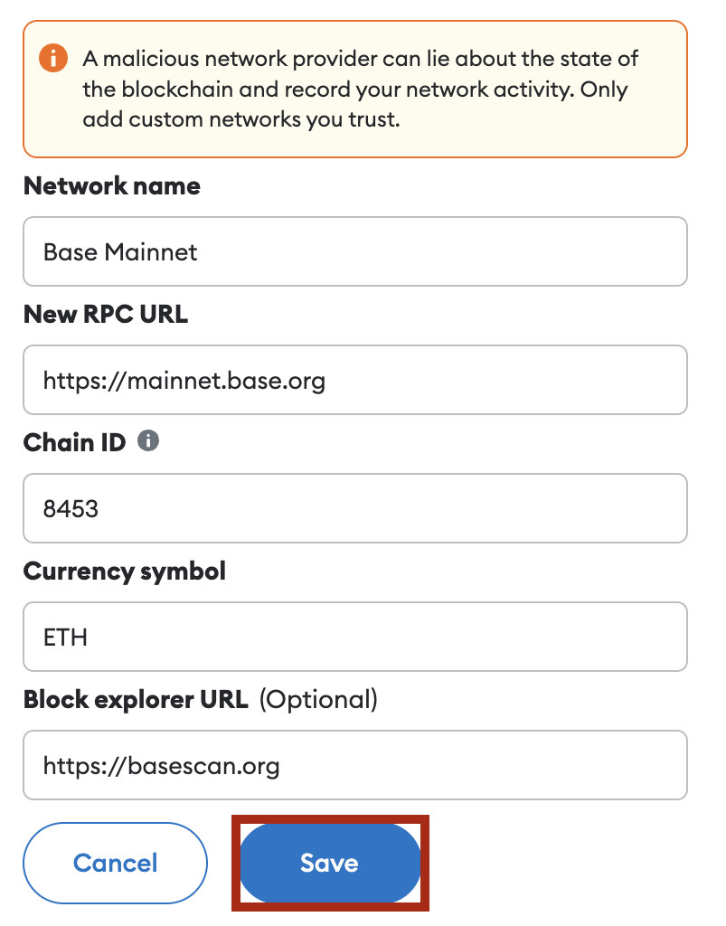5. V dialogovém okně ručního přidání sítě zadejte následující údaje pro testovací síť Base Goerli a klikněte na „Save“ (Uložit):