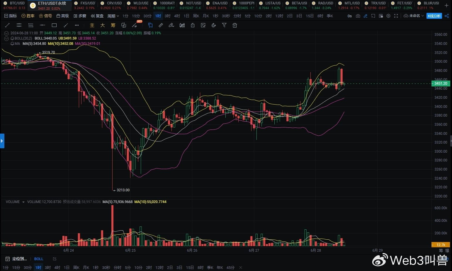 3. Echtzeitdaten Mit Stand vom 27. Juni 2024 beträgt der Preis der ETH 3449,21 US-Dollar, der mittlere Kurs des Bollinger-Bandes liegt bei 3451,27 US-Dollar, der obere Kurs liegt bei 3664,32 US-Dollar und der untere Kurs liegt bei 3238,22 US-Dollar.