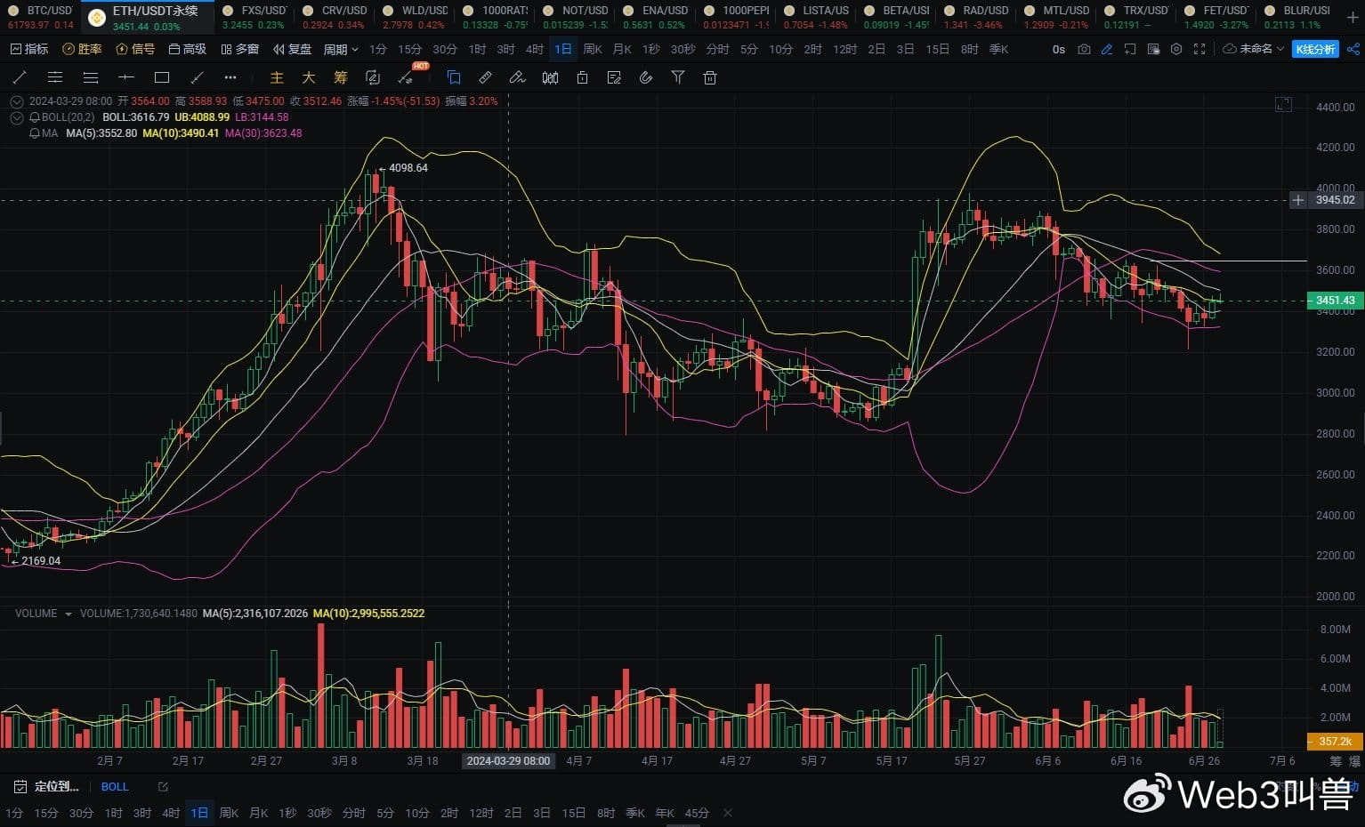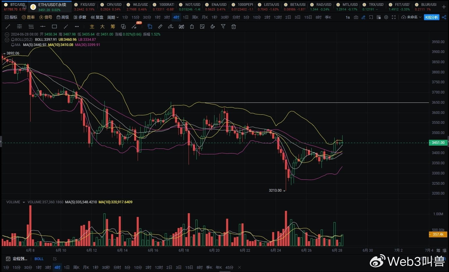 3. Echtzeitdaten Mit Stand vom 27. Juni 2024 beträgt der Preis der ETH 3.449,21 US-Dollar. Der mittlere Kurs des Bollinger-Bandes liegt bei 3.400,00 US-Dollar, der obere Kurs bei 3.500,00 US-Dollar und der untere Kurs bei 3.300,00 US-Dollar.