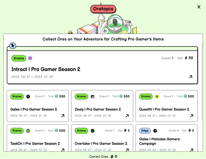 Kroma @kroma_network hat sich mit Intract zusammengetan, um das Missionsevent „Pro Gamer Season 2“ zu starten, um wertvolle Ressourcen wie Erz-NFT und mysteriöse Legierungs-NFT zu sammeln. Verfeinern Sie sie dann im Kroma Creative Universe (KCU) zu Pro-Spieler-Gegenständen, um $KRO-Airdrops zu verdienen. Kromas TGE wurde auf die Mitte des dritten Quartals 2024 verschoben (voraussichtlich August). Es dürfte die letzte Aufgabe sein, bevor die Währung ausgegeben wird. Derzeit sind nur wenige Personen beteiligt.