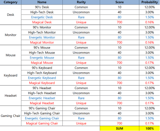 Die Wahrscheinlichkeit, dass die Mystery-Box 6 Gegenstände öffnet, und die Punkte für jeden seltenen Gegenstand. Die Gegenstände müssen auf dem Kroman-PFP ausgerüstet sein, um Punkte zu erhalten. Diese Funktion wird Mitte Juli in der Waffenkammer eingeführt. Die Endpunktzahl des Spielers kann aus der Seltenheit der ausgerüsteten Gegenstände berechnet werden. Wenn 6 Gegenstände die gleiche Seltenheit haben, werden doppelte Punkte erzielt.
