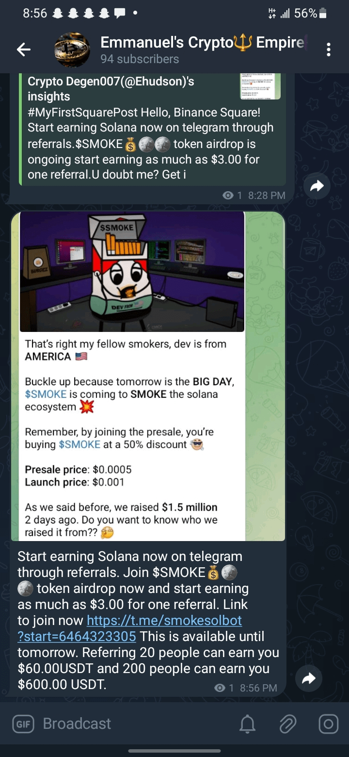 1. Klicken Sie auf den Link in meinem Telegrammkanal (Suche nach Emmanuels Crypto Empire), um am $SMOKE-Token-Airdrop teilzunehmen