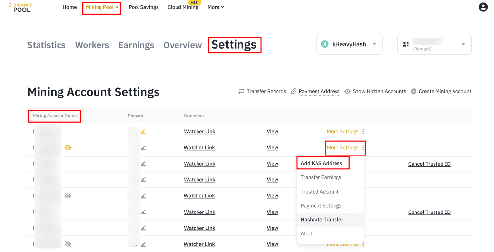 Wählen Sie das Mining-Konto und klicken Sie auf [Weitere Einstellungen] – [KAS-Adresse hinzufügen].