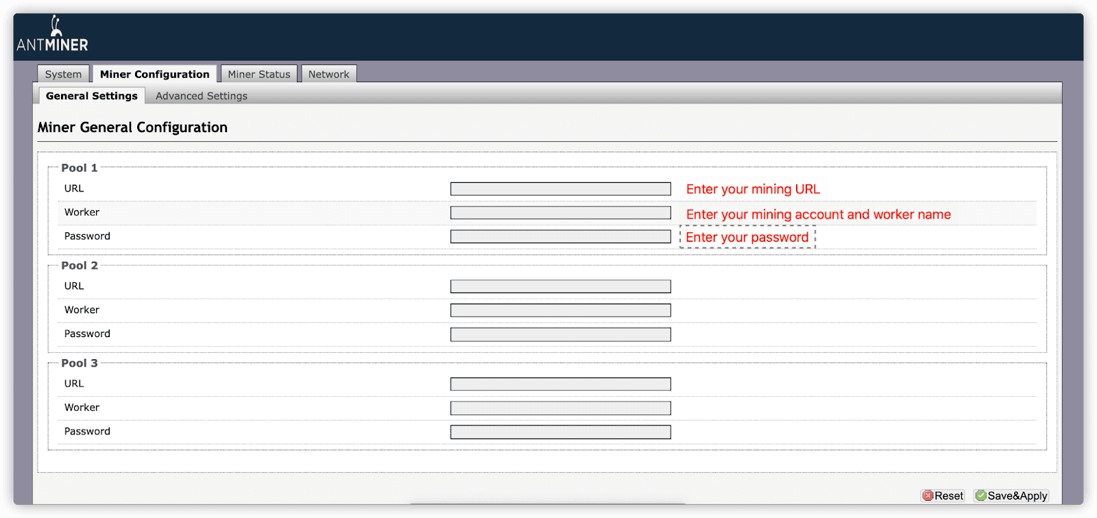 Nehmen wir Antminer als Beispiel. Melden Sie sich bei Ihrem Antminer an und klicken Sie auf [Miner-Konfiguration]. Geben Sie Ihre Daten ein und klicken Sie auf [Speichern und anwenden], um die Einrichtung abzuschließen. Um stabiles Mining zu gewährleisten, empfehlen wir, mehrere Ports einzurichten. Wenn die Verbindung zu einem Port fehlschlägt, wechselt der Miner automatisch zum nächsten und setzt das Mining fort.