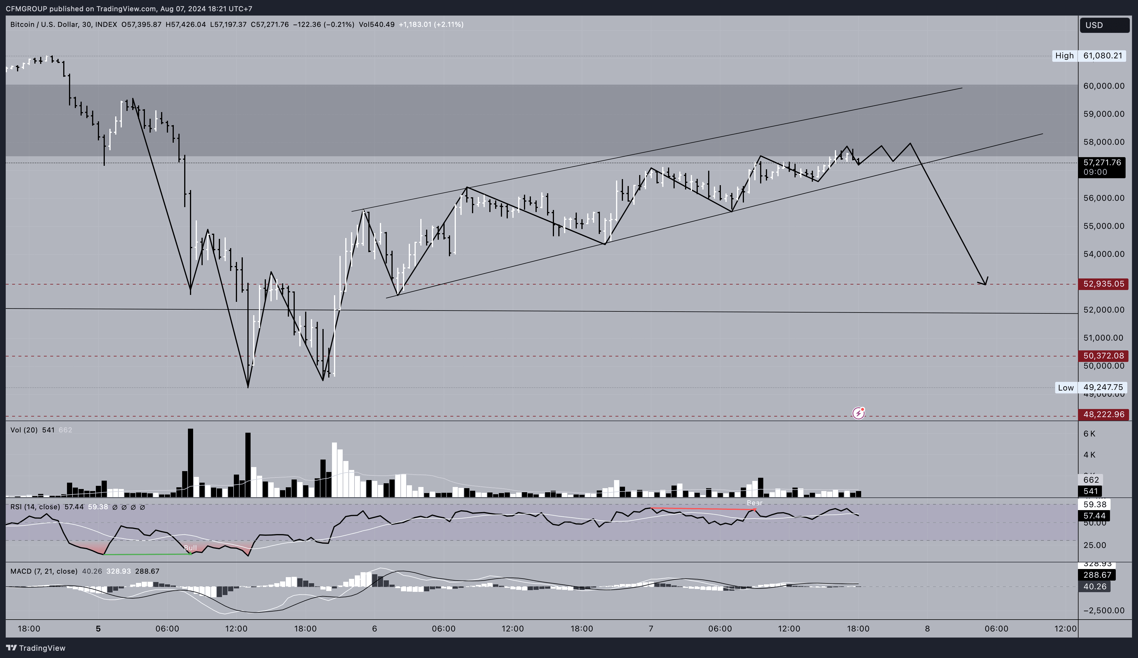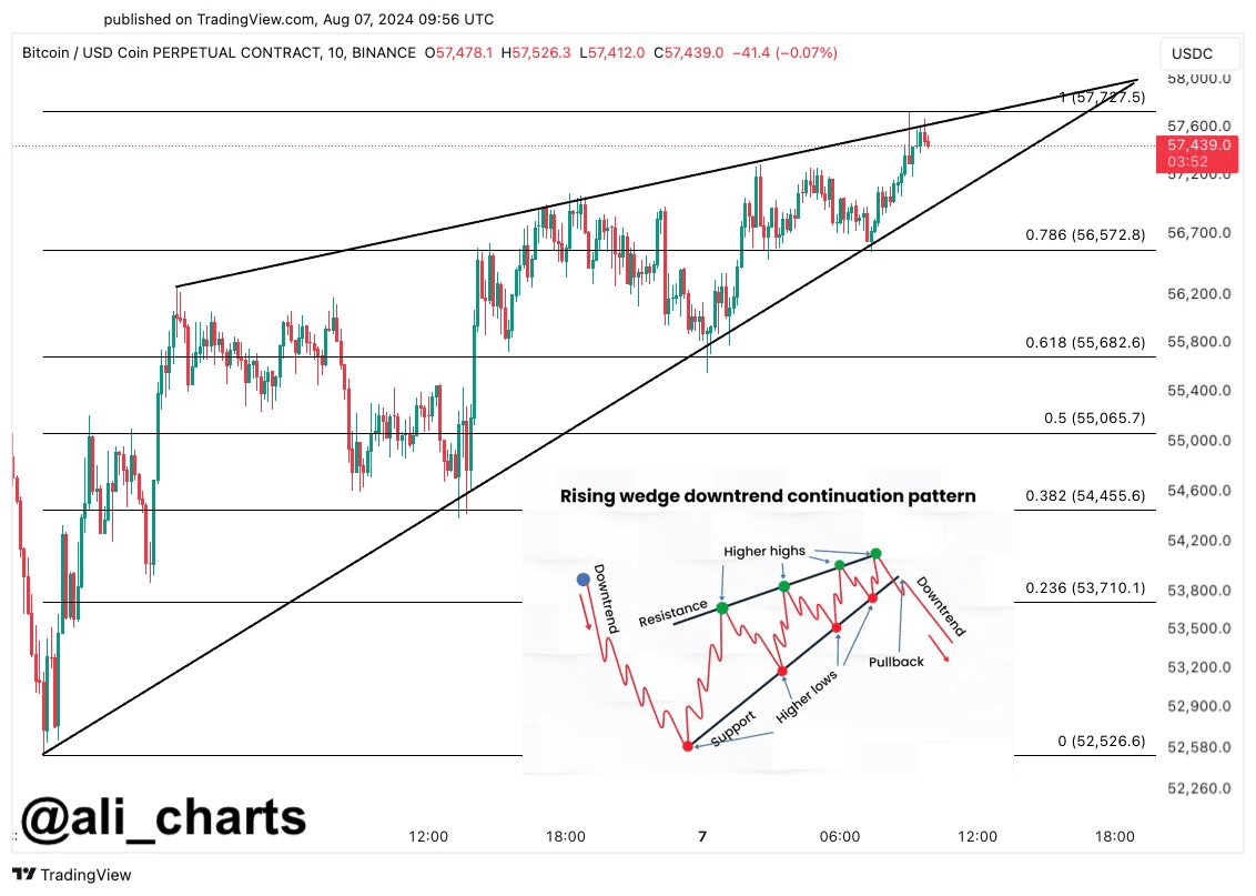 – Der Krypto-Analyst Ali sagt, dass Bitcoin ein „steigendes Keil“-Muster bildet, das oft mit einem Abwärtstrend verbunden ist, mit einer Preisprognose von 56.000 bis 57.000 US-Dollar, aber auch einem Rückgang auf 51.000 US-Dollar.