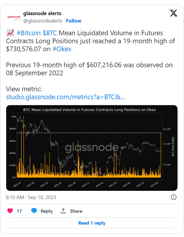 Laut einem Bericht stieg das durchschnittliche Liquidationsvolumen für Long-Positionen in Bitcoin (BTC)-Futures-Kontrakten an Okex auf ein 19-Monats-Hoch von 730.576,07 US-Dollar Dies übertraf das bisherige 19-Monats-Hoch von 607.216,06 US-Dollar vom 8. September 2022.