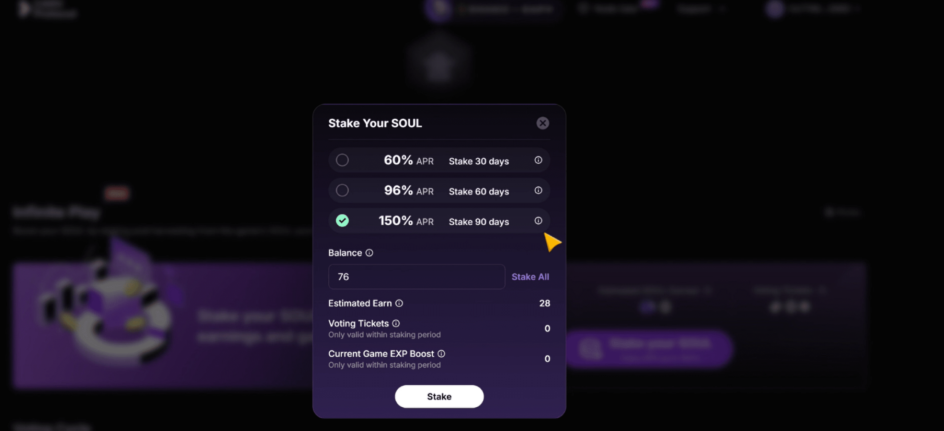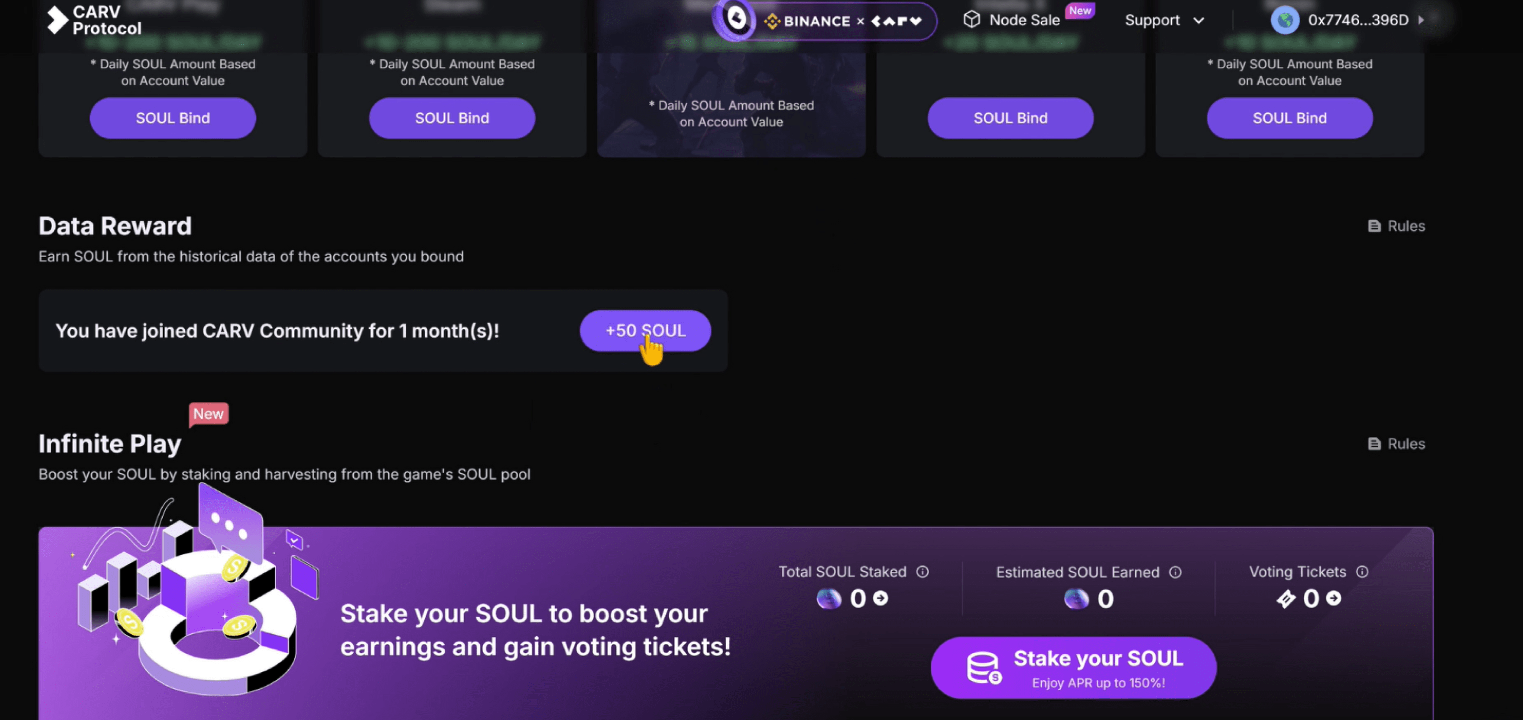 Es gibt auch SOUL, die hier verpfändet werden können, abhängig von der Anzahl der Einsatztage. Dies ist auch die Qualifikation für die Teilnahme am Zusatzprogramm Die gerade von der Projektseite erwähnten Belohnungen. Vielleicht ist es nicht großartig, mit nur einem Stimmzettel Belohnungen wie riesige Mengen an Token, NFTs oder Whitelist-Qualifikationen zu erhalten?
