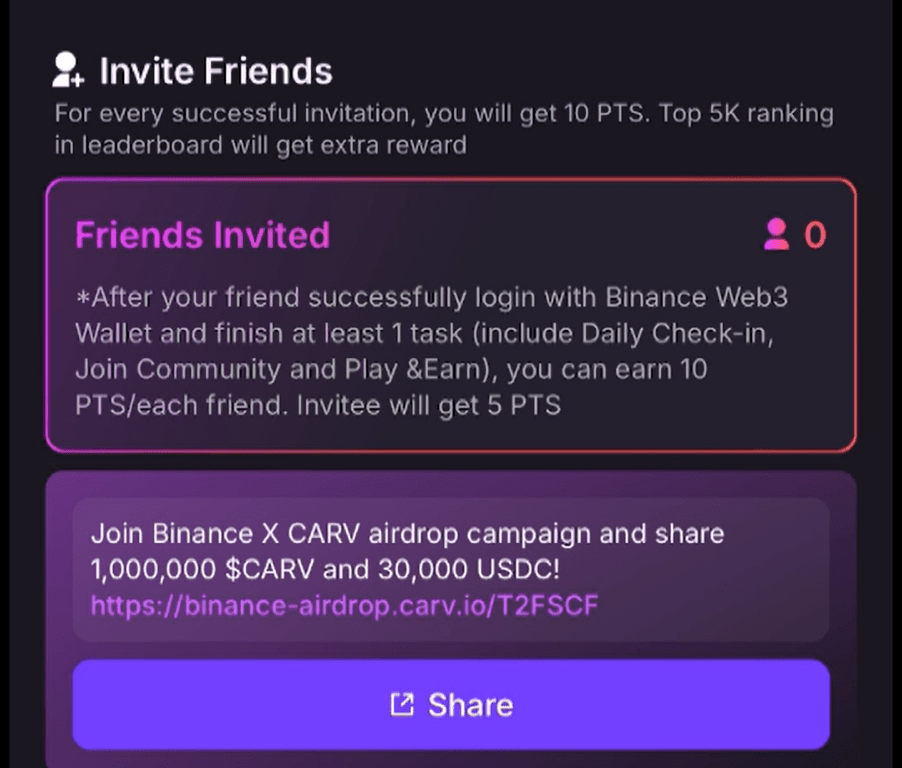 Öffnen Sie zunächst die Binance-Web3-Wallet und klicken Sie auf die Aktivitätsseite. Neben der einfachen Anmeldung werden auch verschiedene Konten verknüpft, um Ihre eigenen Punkte zu erhöhen Gehen Sie zur Projekt-Community und erledigen Sie wöchentliche Aufgaben, um Punkte zu erhalten. Laden Sie andere Benutzer zur Teilnahme an CARV- und Binance-Aktivitäten ein. Abhängig von der Rangliste können Sie unterschiedliche Beträge an $CARV erhalten Belohnungen plus USDC und USDT. Man kann sagen, dass das Projektteam viel Geld investiert hat. Okay, der Einladungscode von Brother J ist T2FSCF Helfen Sie mir auch, auf den Link in der Informationsleiste unten zu klicken, um an dieser Veranstaltung teilzunehmen. Vielen Dank, endlos.