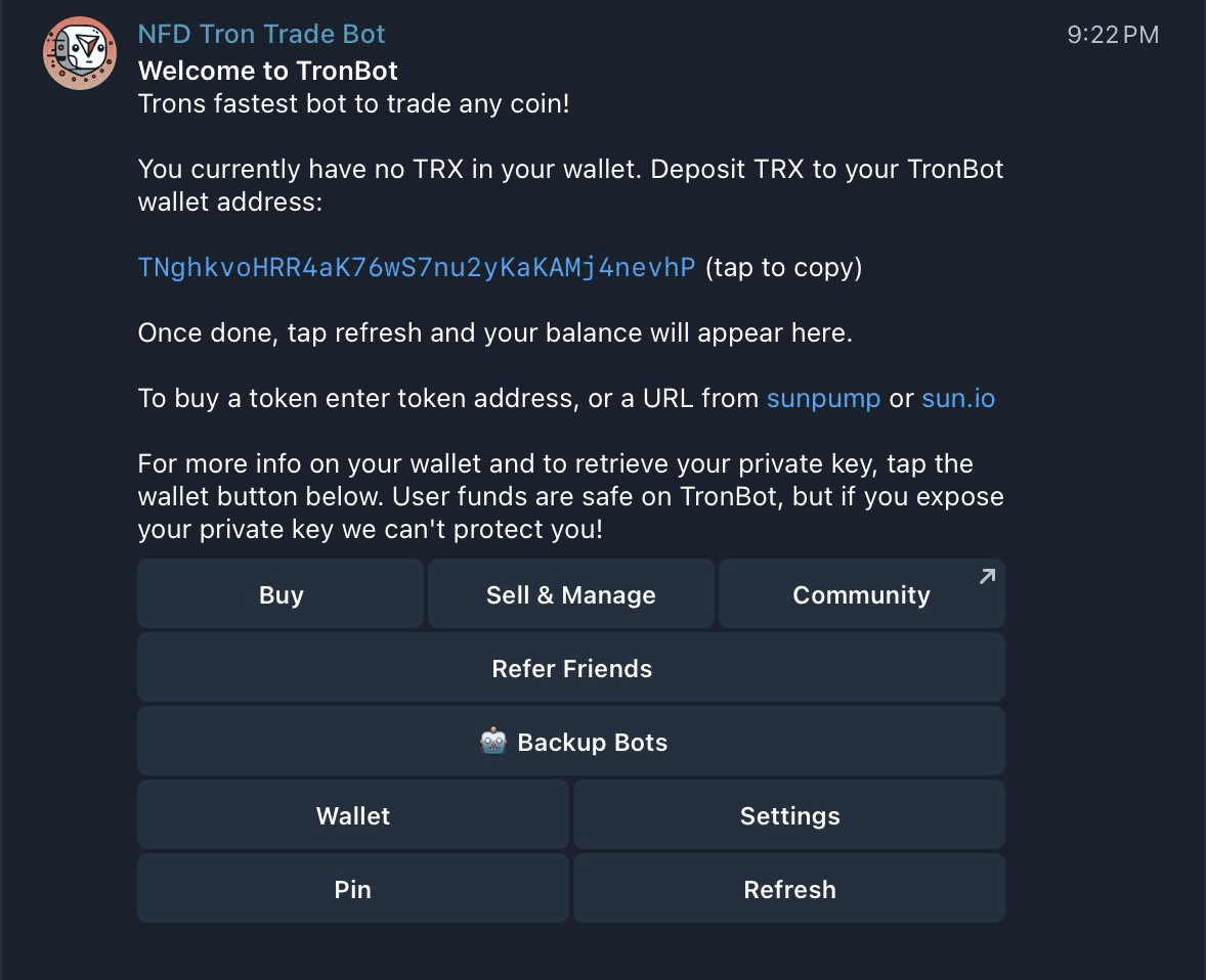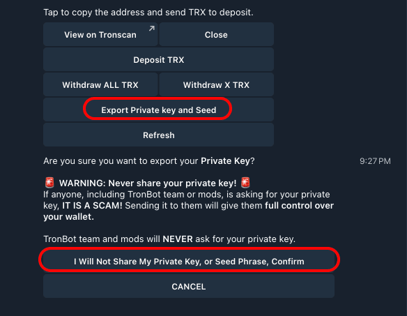 Gehe zum Bot und öffne dein „Wallet“. Exportiere den Schlüssel. Jetzt wird alles angezeigt.