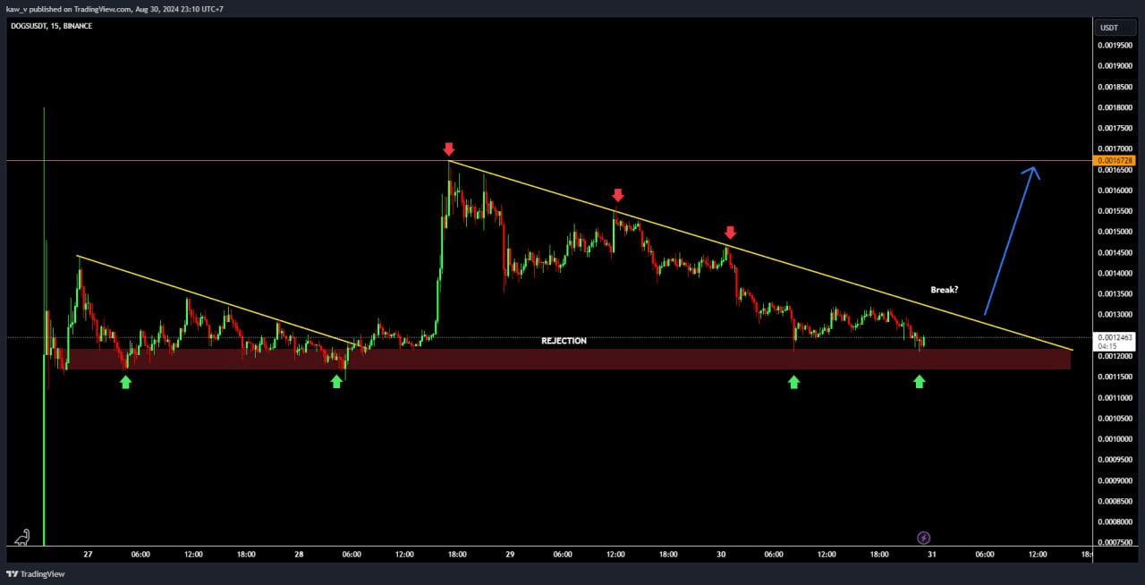 Der 15-Minuten-Chart von DOGSUSDT auf Binance zeigt ein interessantes Muster! Derzeit befindet sich der Preis in einem absteigenden Dreiecksmuster, wobei starker Verkaufsdruck (markiert durch die gelbe Linie) den Preis in Richtung der kritischen Unterstützungszone (rote Zone) drückt.