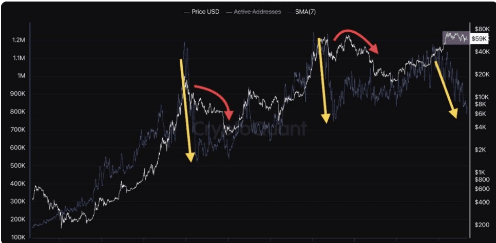 Die Zahl der aktiven Bitcoin-Adressen – die die Gesamtzahl der aktiven Benutzer im Netzwerk darstellt – ist seit Anfang 2024 „deutlich zurückgegangen“, ein Muster, das sich historisch gebildet hat, nachdem der Bitcoin-Preis in den Bullenzyklen 2017 und 2021 seinen Höhepunkt erreicht hatte.