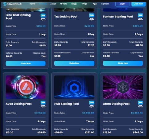 Kostenloses Staking-Bonus: Die bloße Tatsache, dass Sie sich bei STAKING AI registriert haben, berechtigt Sie zu einem kostenlosen Staking-Bonus von 100 US-Dollar. Eigentlich ist dies die beste Möglichkeit, Ihre Staking-Einkünfte von Anfang an zu generieren, ohne ein einziger Dollar Ihres eigenen Geldes einzusetzen.