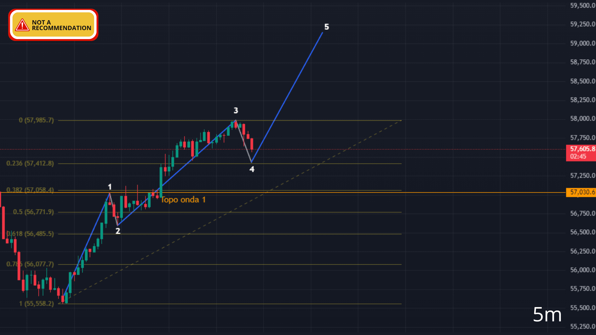 Derzeit beobachten wir sehr kurzfristig eine mögliche Bewegung von 5 Wellen, aktuell befinden wir uns in Welle 4, die auf den Bereich von 0,236 zusteuert. Diese Bewegung kann ungültig werden, wenn Welle 4 die Spitze von Welle 1 überschreitet. (Es wurde ein 5-Minuten-Chart verwendet) $BTC