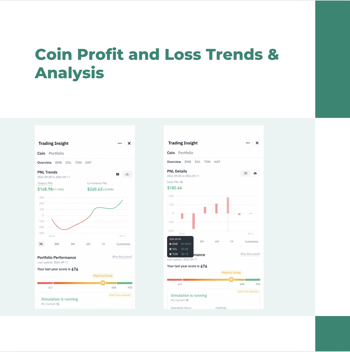 - Gewinn- und Verlustanalyse für Münzen: Bietet eine aggregierte Ansicht der täglichen und kumulierten Gewinn- und Verlusttrends aller Wallet-Bestände (ausgenommen Stablecoins) und der fünf wichtigsten Vermögenswerte mit dem größten Einfluss auf Gewinne und Verluste.