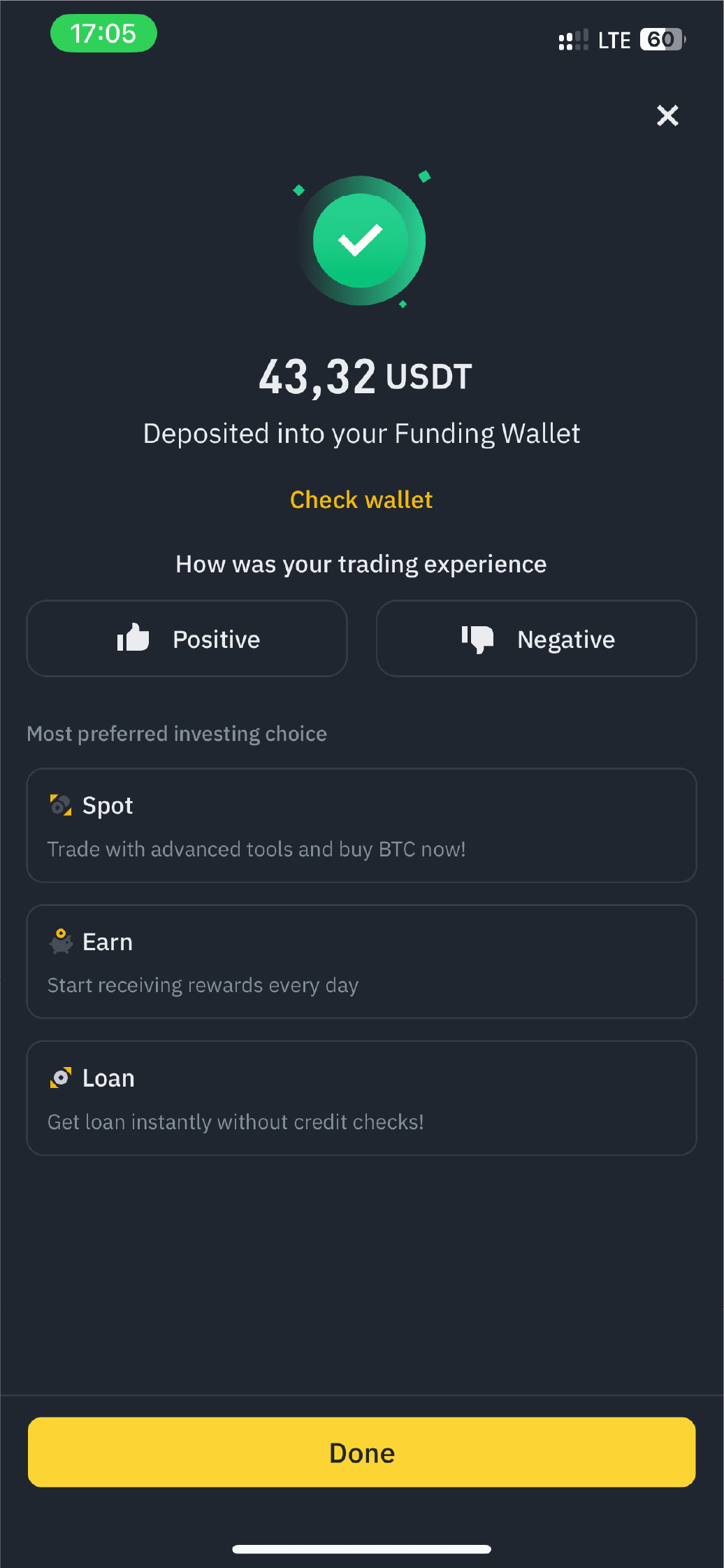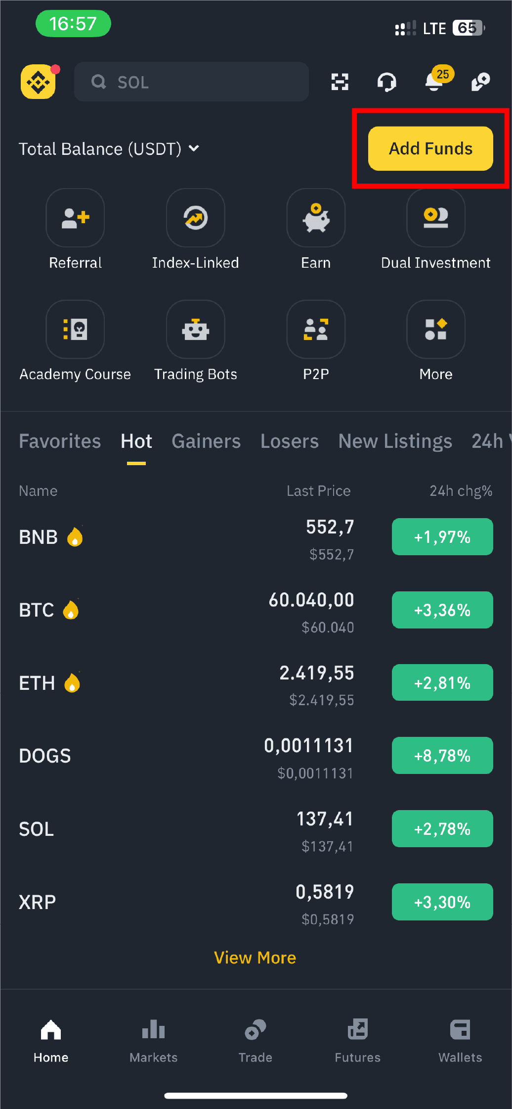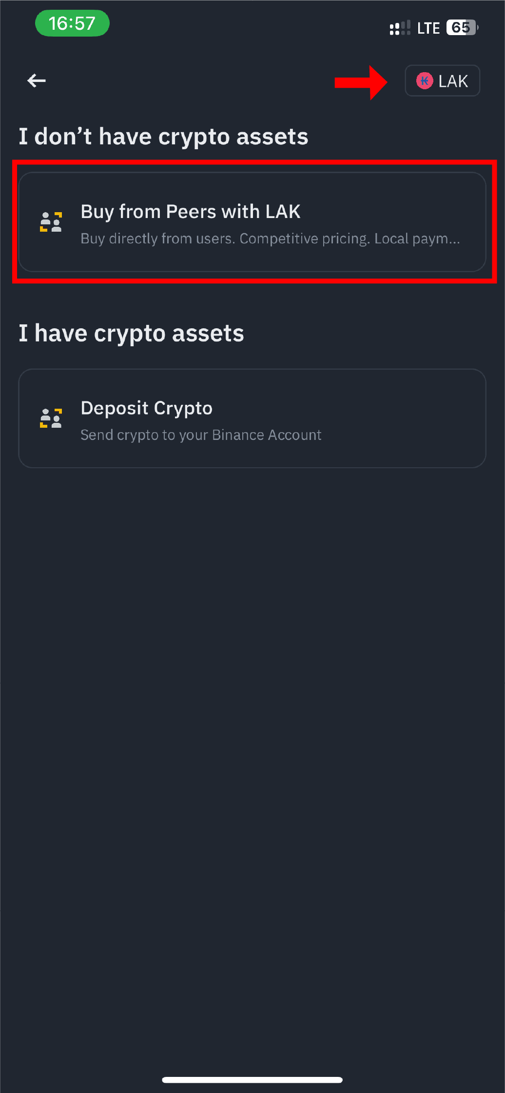 1. Melden Sie sich in Ihrer Binance-App an und klicken Sie auf "Geld hinzufügen" auf der rechten Seite des Bildschirms und wählen Sie die Währung 'LAK' und wählen Sie 'von Peer mit LAK kaufen'