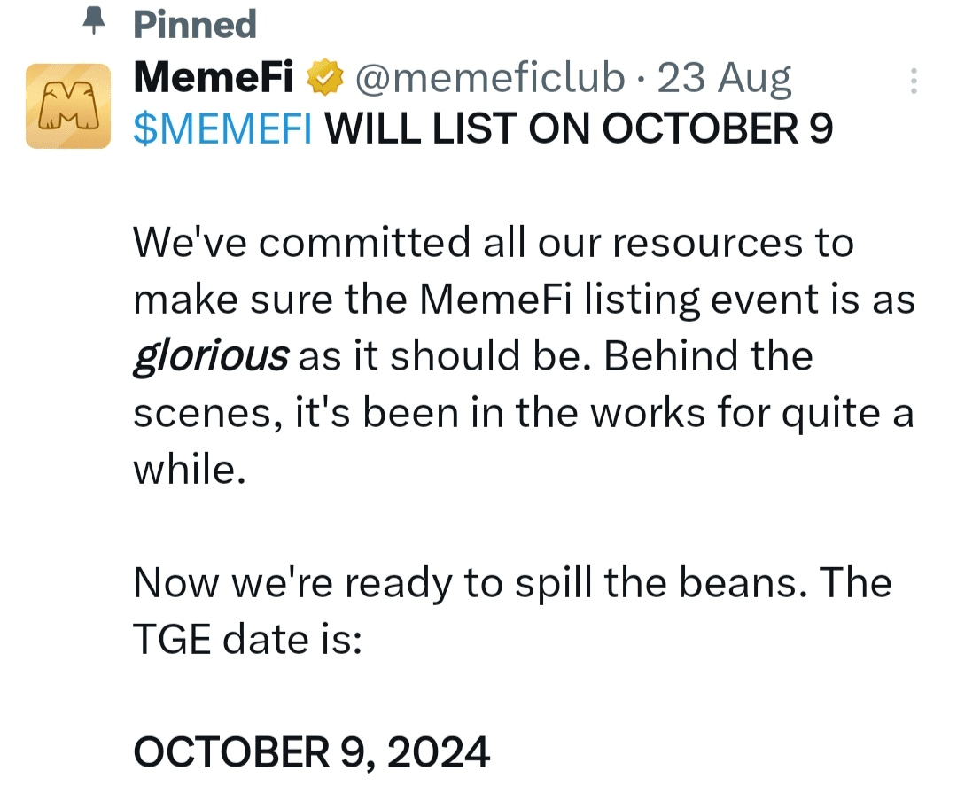 Memefi hat sein goldenes verifiziertes Twitter-Profil bereits veröffentlicht. Memefi-Tap-to-Earn endet bald. Der offizielle Start- bzw. Listungstag des Memefi-Tokens ist der 09. Oktober 2024.