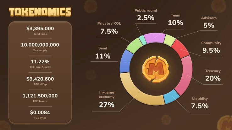 Memefi hat bereits die Tokenomics-Verteilung, das Listing-Datum und den Preis angekündigt. 27 % des Memefi-Tokens werden per Tap verteilt, um Memefi-Telegram-Benutzer zu gewinnen. 11 % Seed-Zweck, 7,5 % Privatverkauf, 2,5 % öffentliche Runde, 10 % Verteilung an das technische Memefi-Team, 5 % Beraterkosten, 9,5 % Community-Kosten, 20 % Treasury und 7,5 % werden Liquidität sein.
