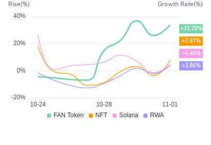 In den letzten Tagen gab es Schwankungen in der Performance der verschiedenen Rennstrecken. Solana und FAN-Token haben an mehreren Daten gute Leistungen gezeigt, insbesondere am 30. Oktober und 1. November hat FAN-Token besonders herausragend abgeschnitten. Auch die NFT- und Meme-Rennstrecken haben einige positive Leistungen gezeigt, aber insgesamt gab es größere Schwankungen. Die Rennstrecken DeFi, AI und Metaverse haben an den meisten Daten eine eher schwache Performance gezeigt. Am neuesten Datum (2. November 2024) hat FAN-Token am besten abgeschnitten, mit einem Anstieg von 0.1781890627959470. Insgesamt hat FAN-Token in letzter Zeit eine sehr starke Performance gezeigt und ein hervorragendes Wachstumspotenzial aufgezeigt. Halten Sie weiterhin die Entwicklungen dieser Rennstrecken im Auge, denn es werden sicherlich weitere Investitionsmöglichkeiten entstehen!