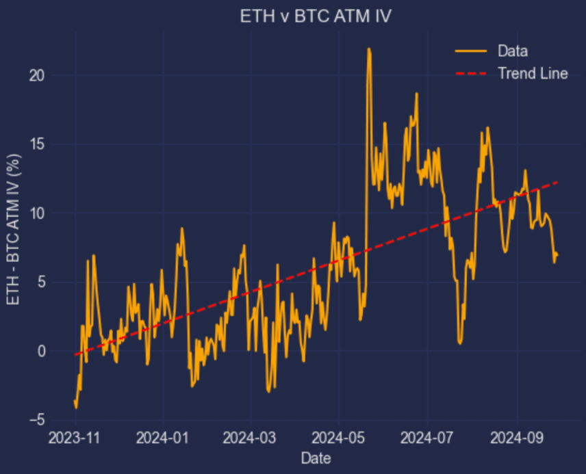Grafik der impliziten Volatilität im Preis von ETH vs BTC. Quelle: Derive