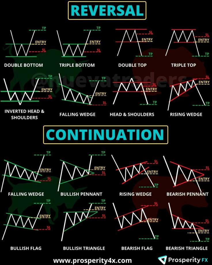 In der technischen Analyse ist das Erkennen von Chartmustern entscheidend für die Vorhersage potenzieller Preisbewegungen auf Märkten, sei es bei Aktien, Devisen oder Kryptowährungen. Diese Muster helfen Händlern, bullische oder bärische Trends zu erkennen und entsprechend zu handeln. Das von Ihnen bereitgestellte Bild zeigt einige der wichtigsten Muster, von denen jedes Einblicke in mögliche Preisrichtungen bietet. Lassen Sie uns in die Details jedes Musters eintauchen: