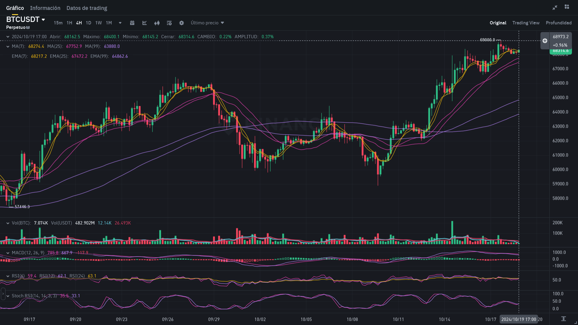 Der 4-Stunden-Chart von BTC/USDT zeigt einen Aufwärtstrend in den letzten 24 Stunden, mit einem aktuellen Schlusskurs von 68314. Das technische Bild deutet jedoch darauf hin, dass eine Korrektur bevorstehen könnte.
