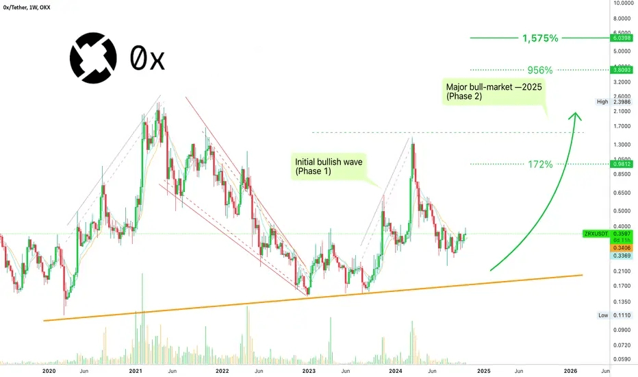 0x ($ZRX ) hat eine langfristige Abfolge höherer Tiefs sowie eine insgesamt wachsende Chartstruktur. Wir haben im März 2024 ein niedrigeres Hoch im Vergleich zum April 2021, aber das ist nicht bärisch, sondern nur ein Zwischenhoch. Dies ist Phase 1 des großen Bullenmarktes 2025. Im Jahr 2025 werden wir ein großes Wachstum haben, einschließlich eines neuen Allzeithochs#High und damit ist die#long-term Abfolge höherer Hochs und höherer Tiefs.