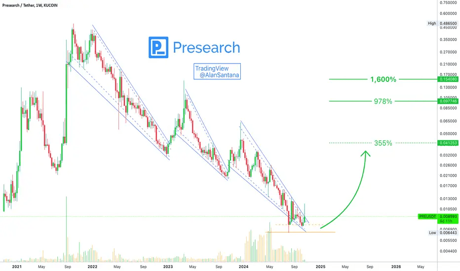 Mögliche Ziele auf dem Chart reichen bis zu 1.600 %, aber es können noch mehr sein. Wir sind jedoch nicht gierig, wir sind mit 300 %, 500 %, 700 % zufrieden, egal, was der Markt hergibt. Unsere Aufgabe ist es, früh einzusteigen und sicherzustellen, dass wir mit Gewinn aussteigen.