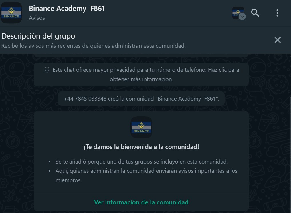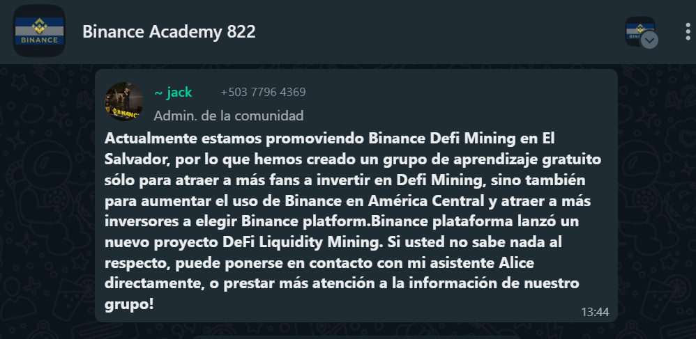 Neuerdings gründen sie in Mittelamerika WhatsApp-Gruppen und geben sich als Binance-Vertreter aus. Diese Gruppen versprechen Investitionen in DeFi Mining (dezentrales Mining) und empfehlen eine private Kontaktaufnahme für weitere Informationen. Das ist ein Betrug. Binance nutzt WhatsApp-Gruppen NICHT zur Werbung für Dienste und kontaktiert seine Benutzer auch nicht auf diese Weise.