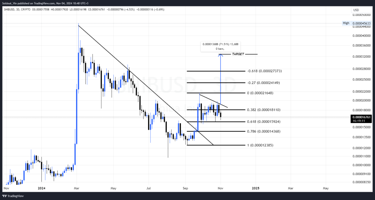 Die Preisprognose für Shiba Inu zeigt, dass das Asset kürzlich eine langfristige Abwärtstrendlinie durchbrochen hat, was auf eine potenzielle Wende zu einem bullishen Trend hindeutet. Derzeit bewegt sich SHIB seitwärts, mit einigen Anzeichen einer Konsolidierung über dem 0,618 Fibonacci-Retracement-Niveau, was auf eine Akkumulation hindeutet.