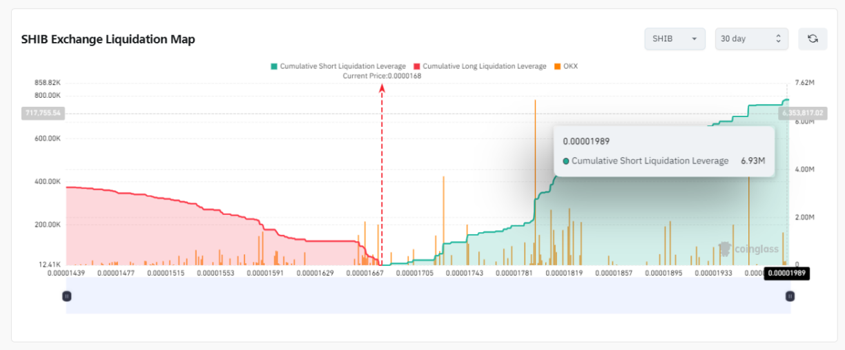 Daten von Coinglass Liquidation Map (LM) zeigen, dass das 30-Tage-Handelsvolumen überwiegend von Shorts dominiert wird. Dieses Ungleichgewicht deutet darauf hin, dass die bärische Stimmung derzeit den SHIB-Markt dominiert, da Händler weitere Tiefststände von dem Meme-Coin in der Zukunft erwarten.