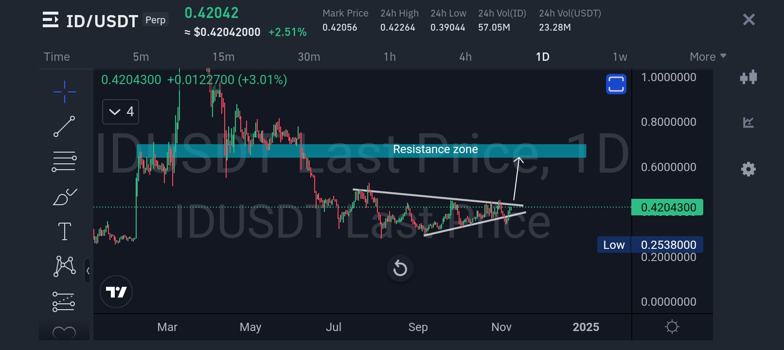Aufsteigendes Dreiecksmuster: ID/USDT bildet ein klassisches aufsteigendes Dreieck, ein bullisches Fortsetzungsmuster, das auf eine mรถgliche Aufwรคrtsbewegung hinweist, wenn es den Widerstand durchbricht.
