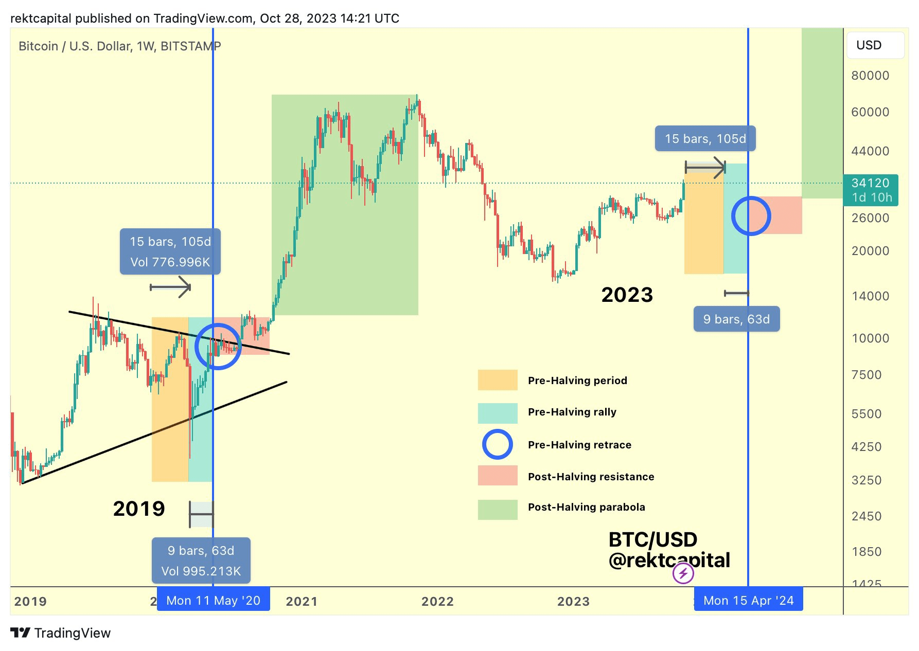 Die Aufwärtsphase vor der Halbierung, in der Anleger nach Schlupflöchern suchen, um in den Markt einzusteigen, führt zu einem ziemlich starken Rückzug und führt in der Regel einige Monate später nach der Halbierung zu außergewöhnlichen Renditen für Anleger. Aus historischer Sicht wiederholt sich das immer wieder so und natürlich ist diese Phase eine wichtige Phase, um die Mentalität und das Vertrauen in Bitcoin aufrechtzuerhalten, denn nach der Anstiegsphase folgt eine Rückzugsphase, in der es zu einem hohen Hype kommen wird an ihre Stelle treten Zweifel und Angst bei den Anlegern. Rekt Capital verwies als Beispiel auf die Ereignisse während der Halbierung in den Jahren 2016 und 2020, als Bitcoin einen Rückgang von 38 % bzw. 20 % erlebte. Von da an wird die Wiederakkumulationsphase kommen und mehrere Monate dauern, gefolgt von der letzten Phase eines parabolischen Anstiegs, die laut dem Analysten eine Zeit sein wird, in der Bitcoin ein sehr schnelles Wachstum in Richtung seines Allzeithochs erleben wird ( ATH). #BinanceSquare #halving #Crypto2024 #bitcoin $BTC $ETH $XRP