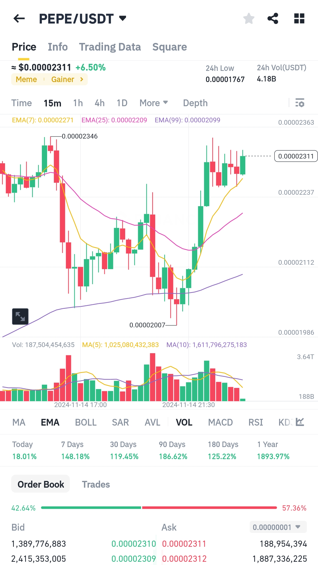 Der Preis befindet sich derzeit in einem starken Aufwärtstrend mit hoher Volumenunterstützung. Wenn er bei anhaltendem Volumen den Widerstand bei 0,000002400 USD durchbrechen kann, könnte dies auf eine Fortsetzung der Aufwärtsdynamik hindeuten.