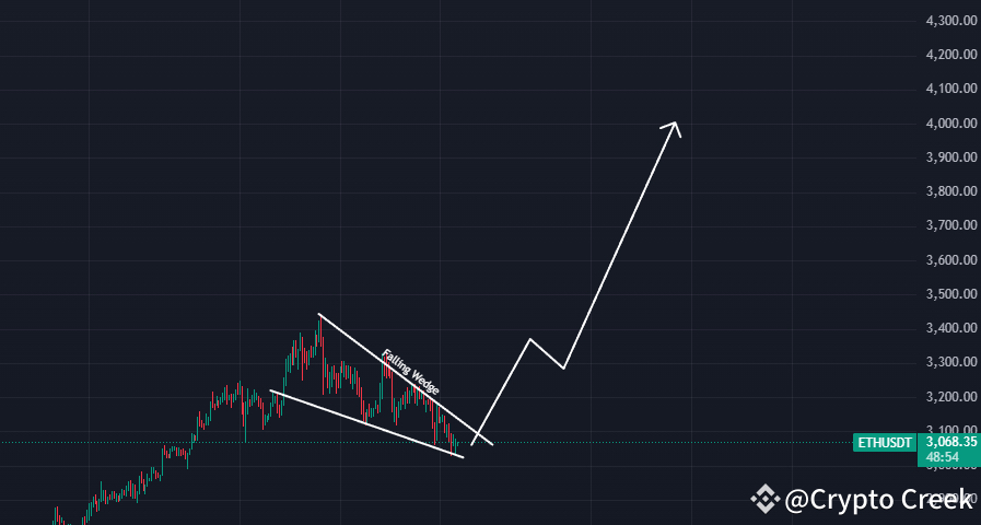 Wie wir sehen können, hat ETH ein Falling Wedge-Muster gebildet. Das ist ein bullisches Trendfortsetzungsmuster. Erwarten Sie also einen Anstieg bei ETH, der Markt braucht nur eine Korrektur, um höher zu pumpen.