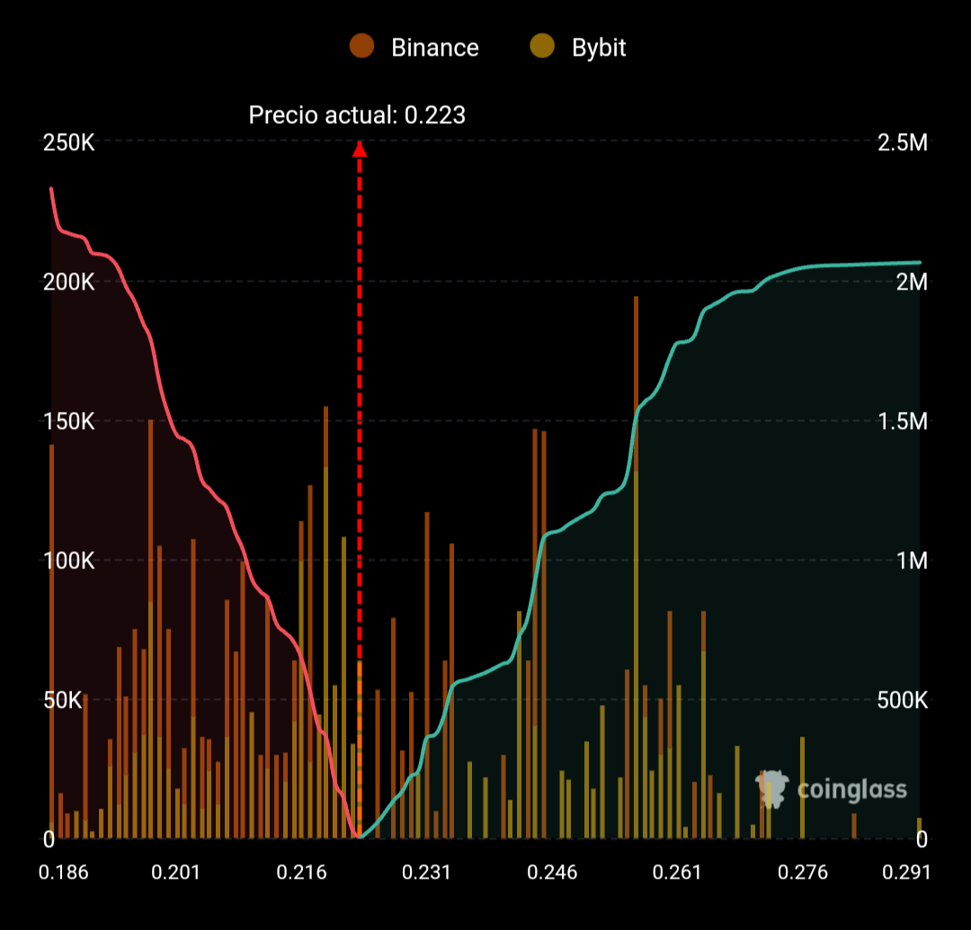 Dies deutet darauf hin, dass der Preis einem Aufwärtsdruck ausgesetzt sein könnte, wenn eine erhebliche Anzahl von Short-Positionen auf Niveaus nahe 0,23-0,25 liquidiert wird.