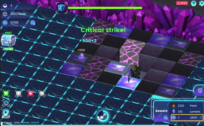 Wählen Sie einen benachbarten Block aus und klicken Sie auf die Schaltfläche „Mine“. Alternativ können Sie auch doppelklicken, um jeden benachbarten Block direkt abzubauen. Es besteht die Möglichkeit, USDC zu erhalten.