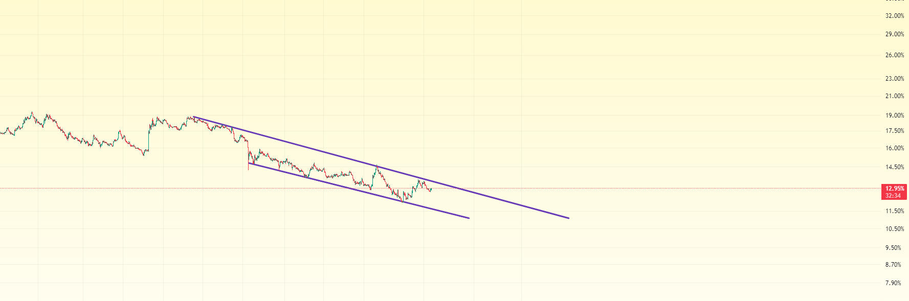 Im Ethereum-Dominanzdiagramm ist ein fallendes Keilmuster zu erkennen. Ich hoffe, Sie wissen, dass ein fallender Keil ein bullisches Muster ist. Wenn er seine Widerstandslinie durchbricht, wird er explodieren.