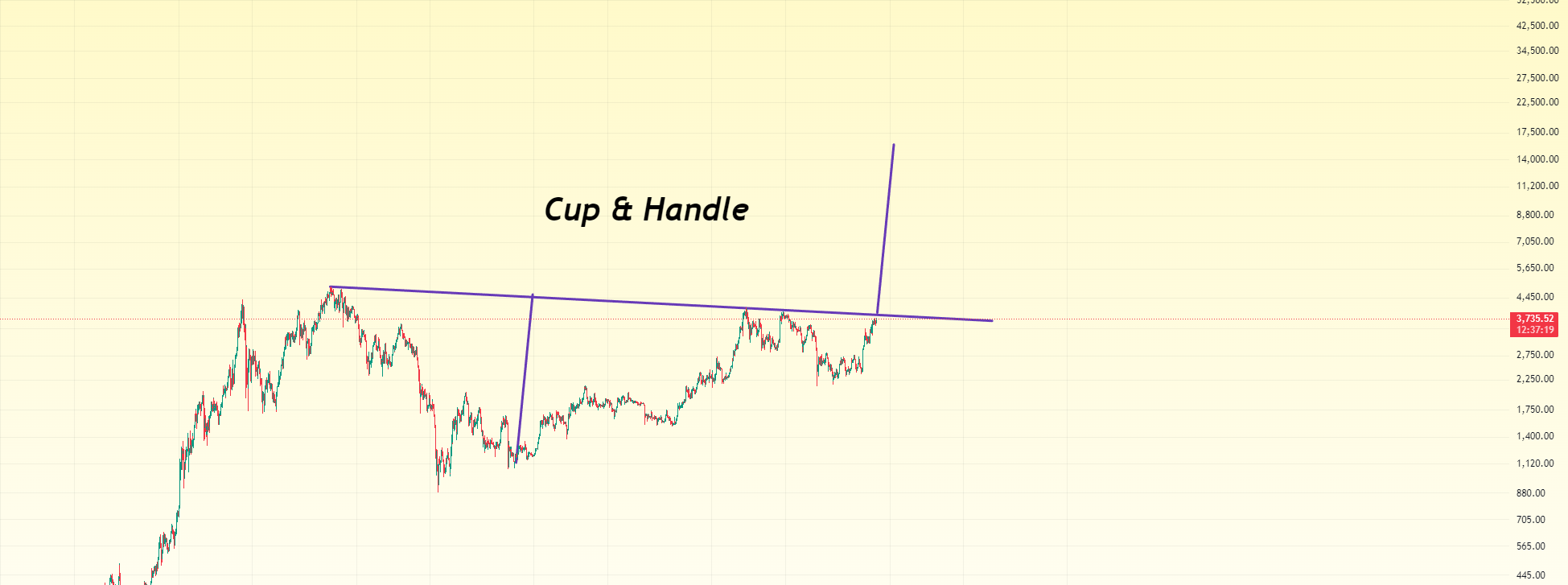 Im Total2-Chart sehe ich, dass hier ein Cup-and-Handle-Muster entstanden ist. Nach dem Cup-and-Handle-Muster kann ich sicherstellen, dass sich dies in einem bullishen Muster befindet, auch die Kerzen haben die Widerstandslinie durchbrochen. Daher wird Ethereum steigen. Die Marktkapitalisierung der Altcoins wird 3,89 Billionen $ erreichen, also bin ich gerade bullish. Es wird also stark steigen.