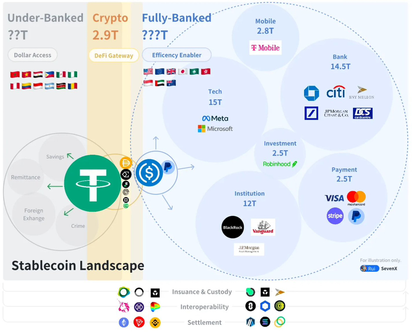 - Derzeit gibt es drei Arten von Stable: Crypto Native, Fully-Banked und Under-Banked: Crypto Native ist der Stablecoin in Krypto, Fully-Banked ist USD, der in Ländern und Organisationen zirkuliert, und Under-Banked ist Fiat-Währung in sekundären Regionen ( Darüber werde ich später sprechen)
