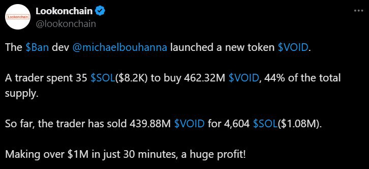 Kunst trifft auf Krypto-Chaos! Sotheby’s VP Michael Bouhanna hat einen weiteren Solana-Memecoin, #VOID , gestartet, und ein glücklicher Händler verwandelte 8.200 $ in nur 30 Minuten in 1 Million $! 🎉💸