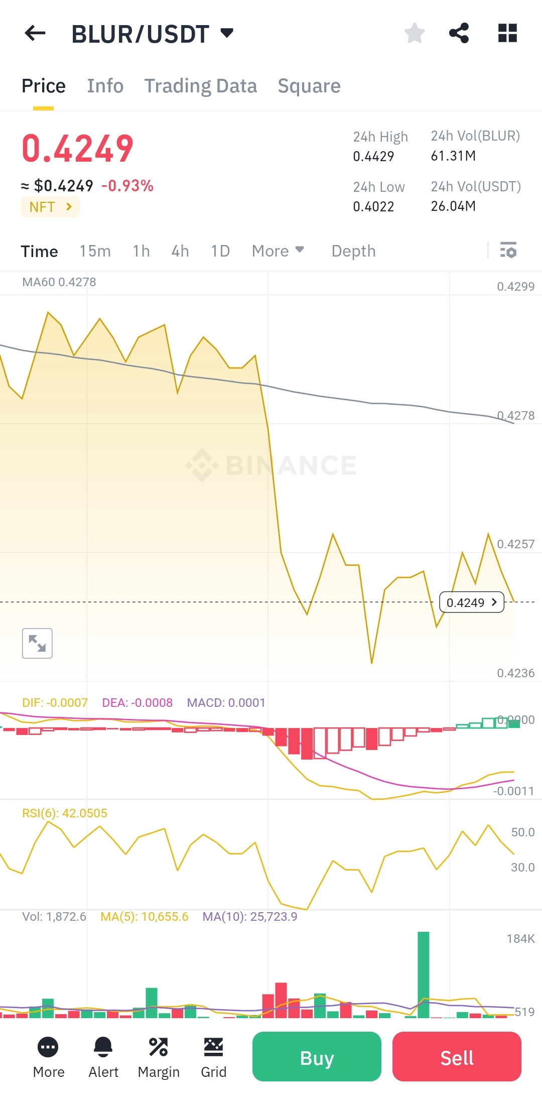1) Aktueller Preis: Der BLUR/USDT-Handelspreis schwankt derzeit um 0,426 $ Binance