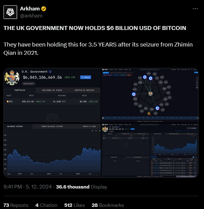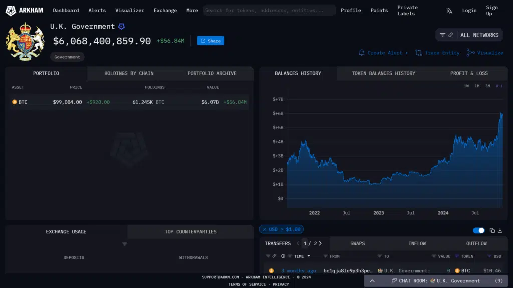Laut der Blockchain-Analysetools-Plattform Arkham Intelligence hält die britische Regierung Milliarden von Dollar in Bitcoin. Ein Wallet, das mit der Regierung verbunden ist, enthält 61.245 BTC, die ungefähr 6 Milliarden Dollar wert sind, mit einem geschätzten unrealisierten Gewinn von über 28 Millionen Dollar aus dem Preisanstieg von Bitcoin.