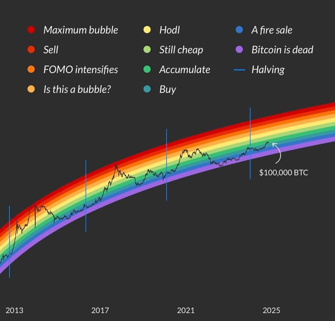 Basierend auf dem Regenbogen könnten die nächsten Ziele zwischen $150.000 und $300.000 für 2025 liegen, abhängig von der Intensität des Aufwärtstrends.