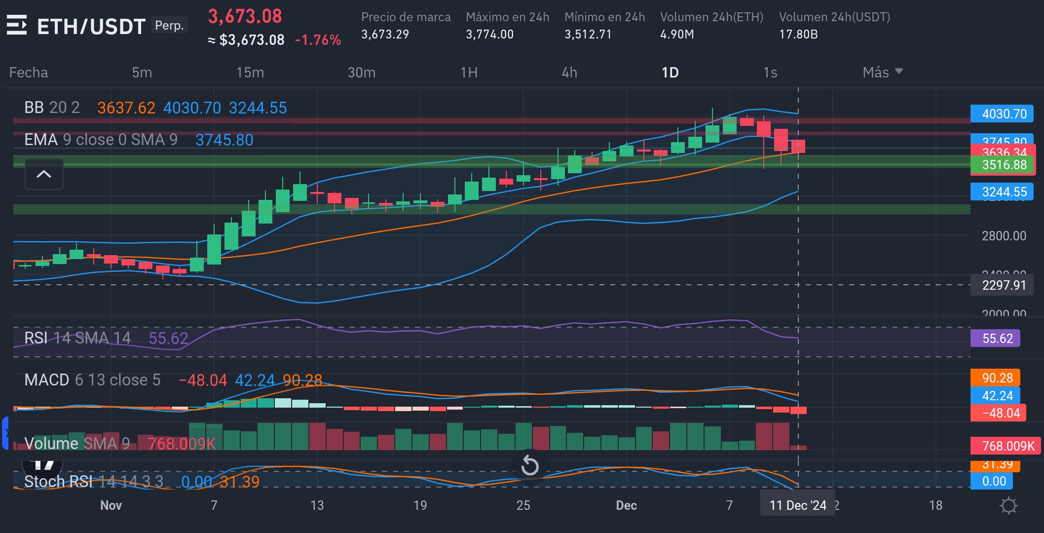 Der aktuelle Preis von ETH/USDT beträgt 3.673,08 $, ein Rückgang von -1,76 %.