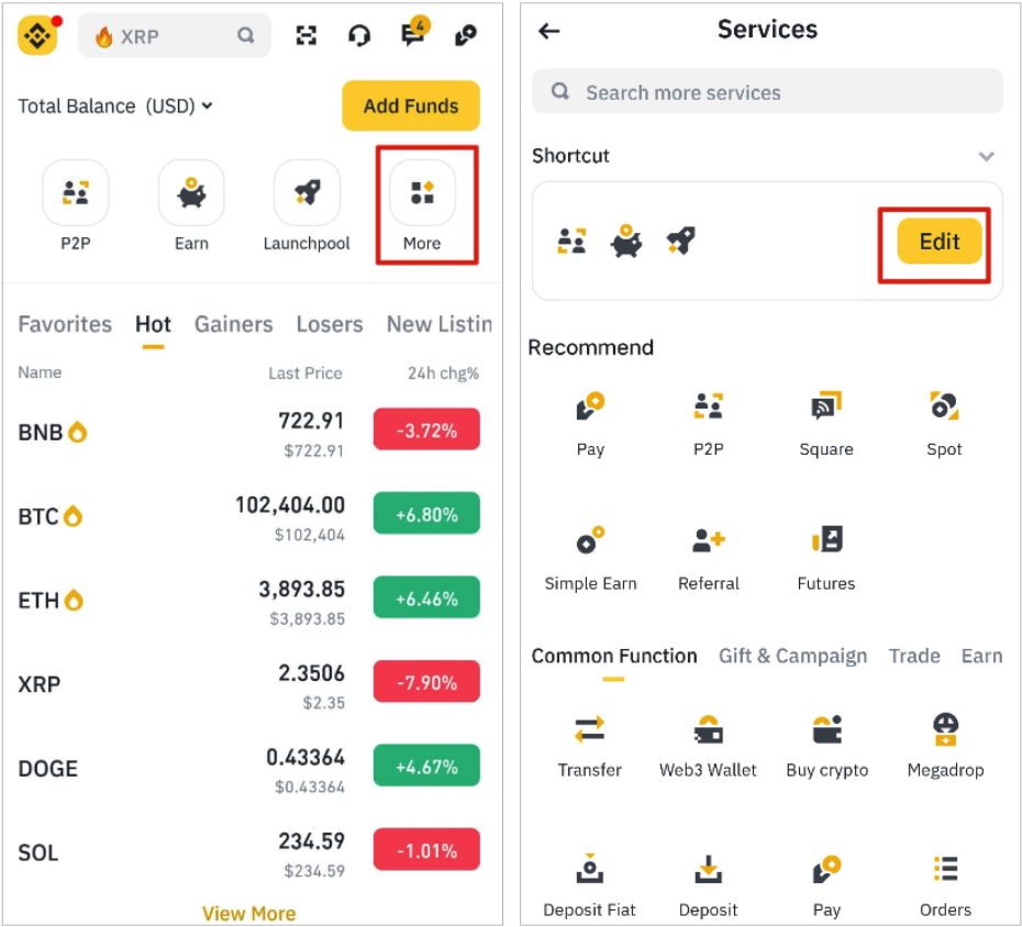 Tippen Sie auf [Mehr] auf der Startseite, und wählen Sie dann [Bearbeiten] auf der Diensteseite.
