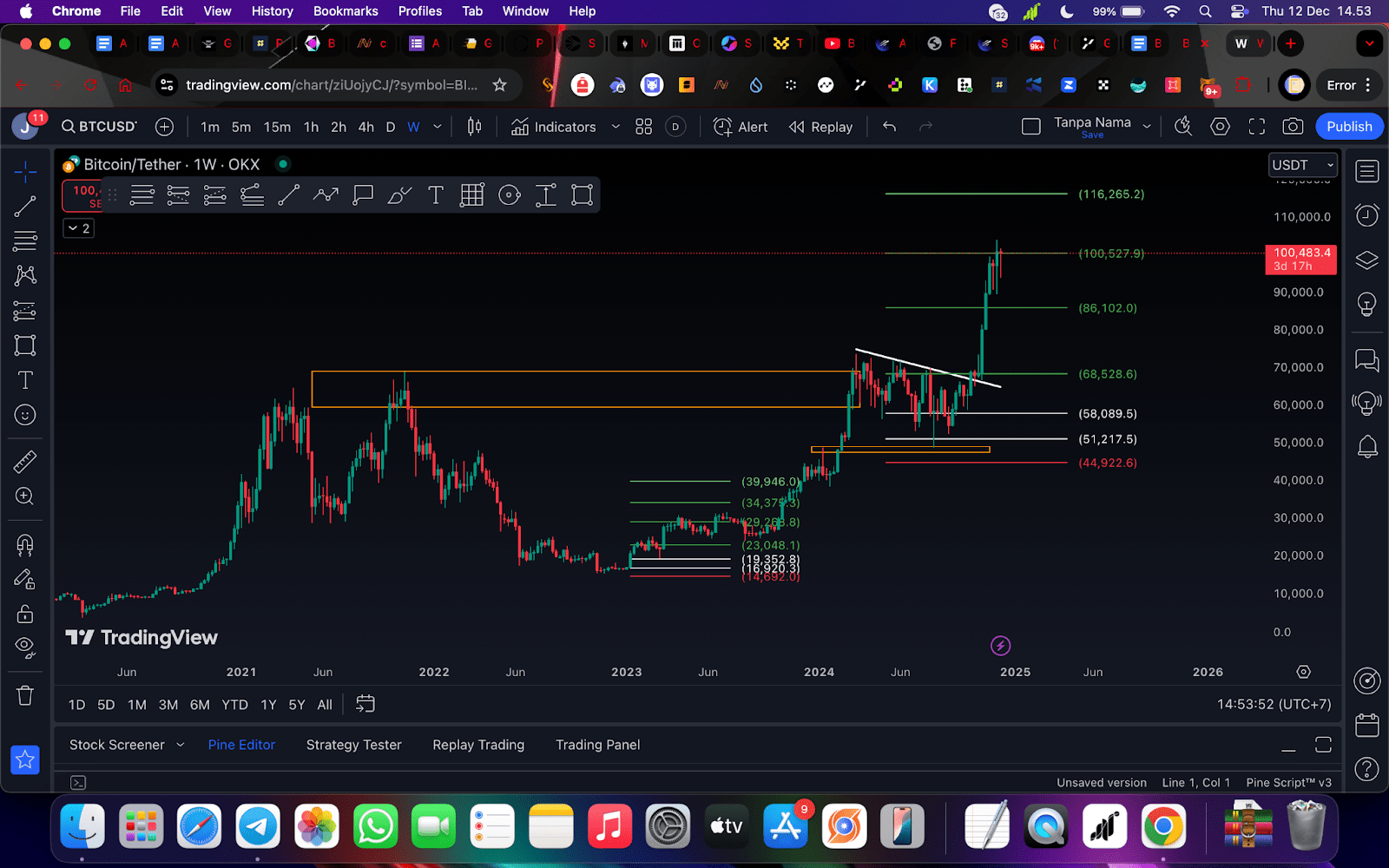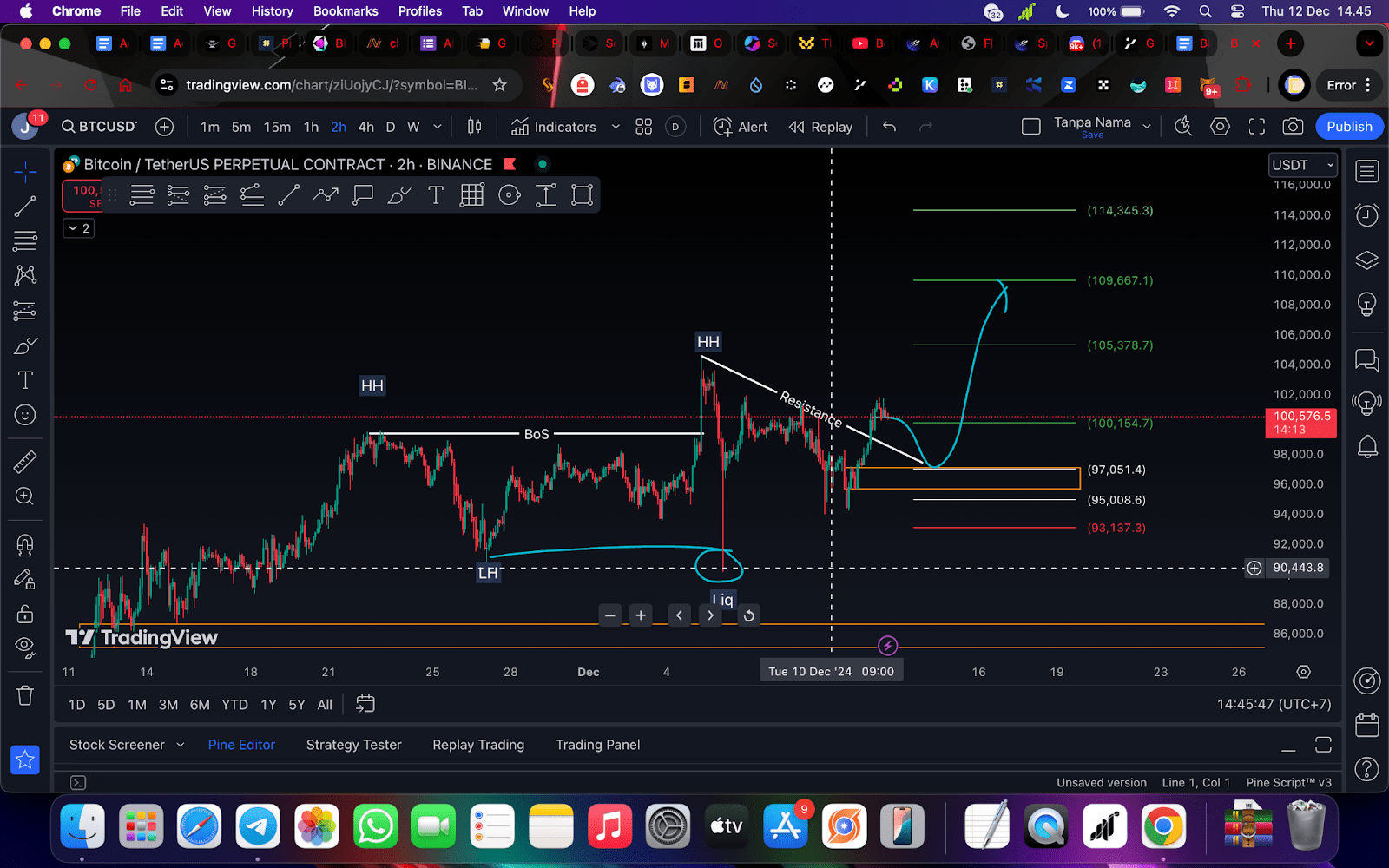 Als ich diesen Artikel schrieb, lag die Position von Bitcoin bei 100.500 US-Dollar, wobei es in meiner Zukunftsprognose möglich ist, dass Bitcoin für einen erneuten Test einen Rückgang auf 95.000 bis 97.000 US-Dollar erleben wird, bevor es weiter steigt. Das Ziel für den 4H tf liegt bei den Preisen 100154 - 105378 - 109667 - 114345. Vielleicht fragt sich jemand, warum mein Pfeil nur das dritte Ziel erreicht? denn aus dem Backtest, den ich durchgeführt habe, erreichen laufende Gewinne oft TP 3 und die Wahrscheinlichkeit für TP 4 ist geringer. Bitte denken Sie daran, dass die Invalidierungsposition des 4H TF hier bei Level 93137 liegt