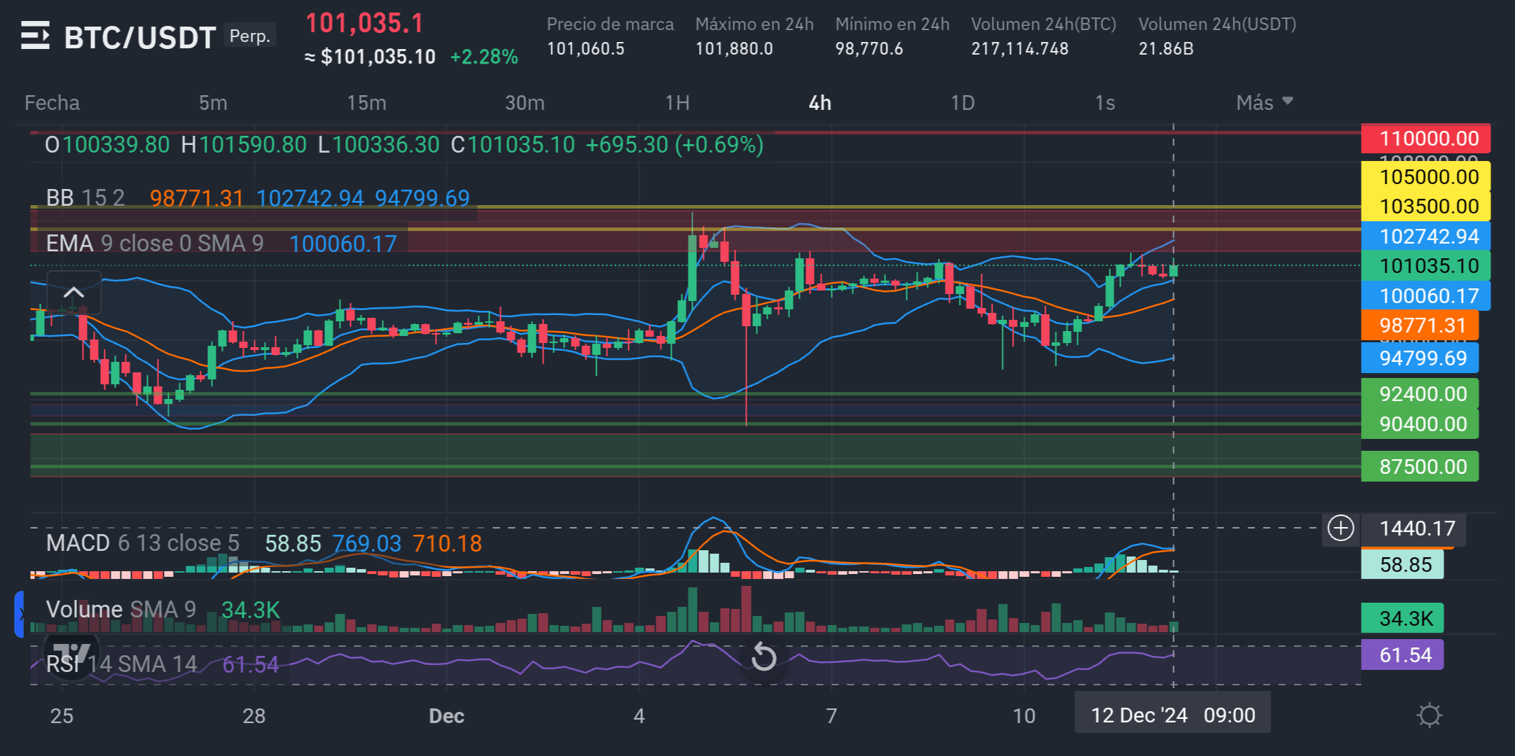 Der 9-Perioden-EMA (Exponential Moving Average) liegt bei 100.060,17 USDT.