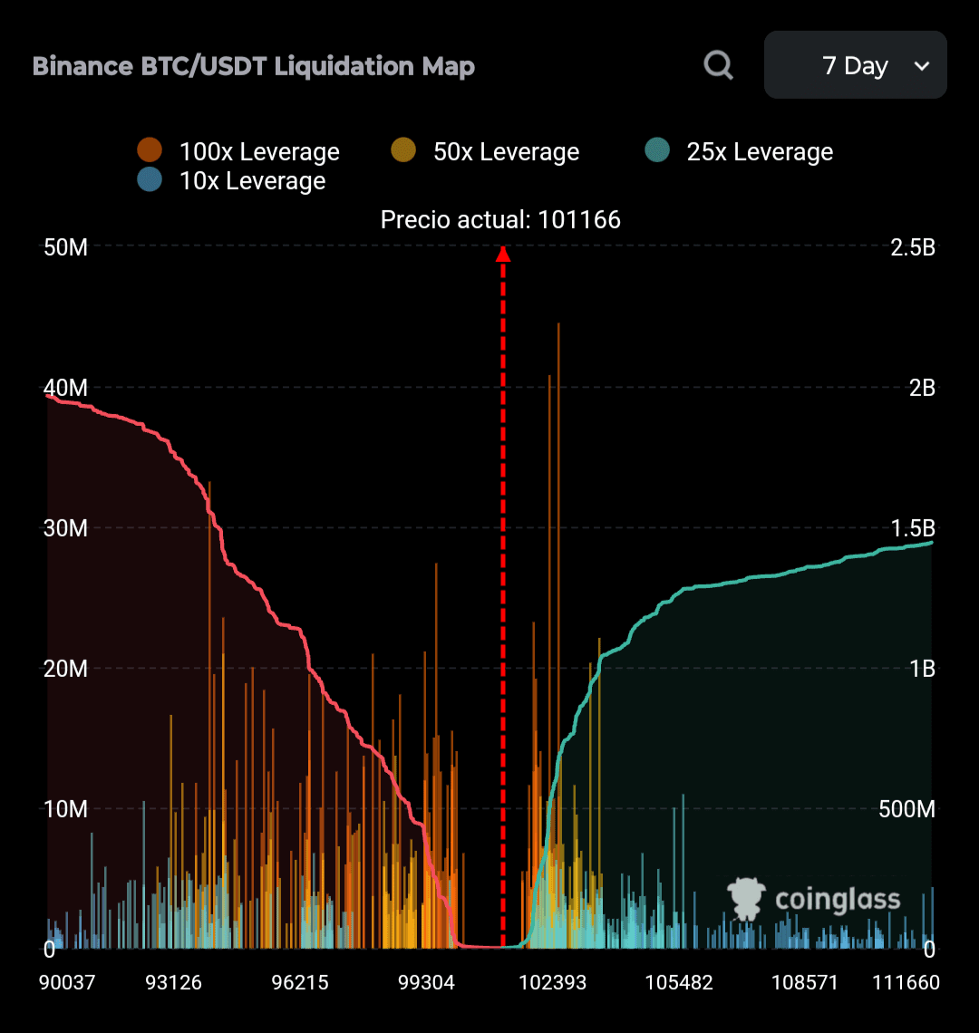 Die Karte zeigt eine starke Konzentration von Verkaufsaufträgen auf Niveaus über 101.000 USDT, was zu potenziellem Widerstand in diesem Bereich führen könnte.