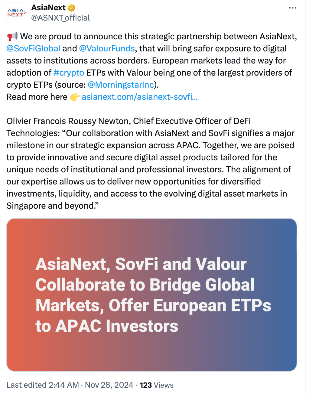 Im November unterzeichnete Valour ein Memorandum of Understanding zur Listung der Valour ETPs an der in Singapur lizenzierten Wertpapierbörse AsiaNext mit der Derivate-Handelsplattform AsiaNext und der Ausgabeplattform Sov.fi.